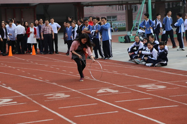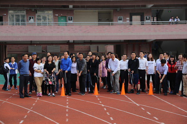 比赛开始前,一直非常关心学校“四点半”阳光体育运动的陈汉城副校长和学生处李齐玲主任也来到了现场,为大家加油鼓劲,并合影留念。教师和家长们对这个童年时代非常熟悉的体育项目热情高涨,积极做着热身准备,会滚的不会滚的都竞相拿上铁环先行体验了一番。